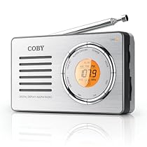 Coby CX50 compact AM/FM radio with digital display sensitive AM/FM tuner digital LCD display integrated full-range speaker high-performance telescopic antenna clock/alarm function convenient hand strap 3.5mm headphone jack silver